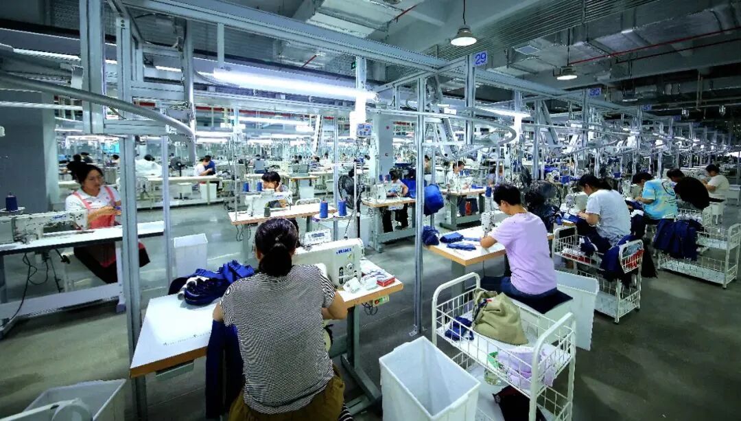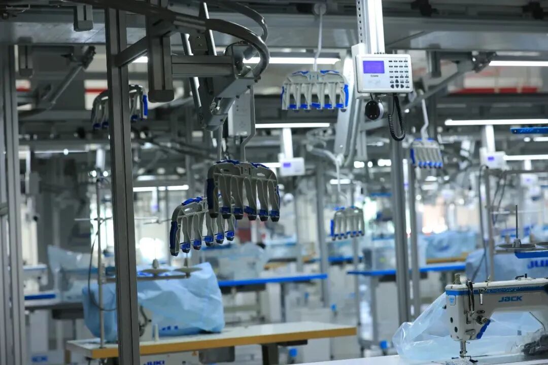 步入5600平方米的智能车间,与印象中制衣行业人员密集、地面物料小车来回穿梭的生产场景不同,首先映入眼帘的智能悬挂系统就令人眼前一亮。上方悬挂的链条,宛若整个车间长出多条灵活的手臂,每条手臂都可以根据生产实时情况变换节奏,精准抓取袖口、衣领、前襟等一件件组成服装的“零部件”,将其送到各工位。