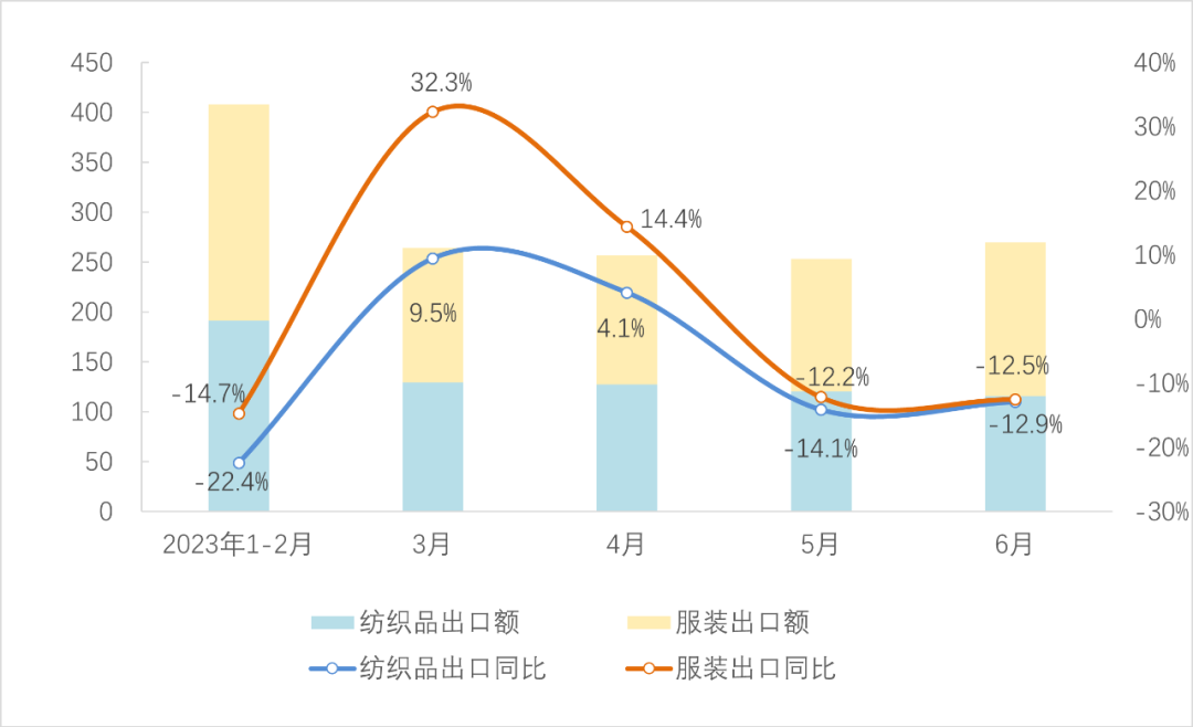 今年二季度以来,行业外贸形势较为严峻,4月我国纺织品服装出口额同比增速明显放缓,并于5月落入负增长区间。6月当月,我国纺织品服装对全球出口269.9亿美元,同比减少12.7%(以人民币计同比下降8.8%),降幅较上月略有收窄。其中,纺织品出口115.7亿美元,同比减少12.9%(以人民币计同比减少9%);服装出口154.2亿美元,同比下降12.5%(以人民币计同比减少8.7%)。
