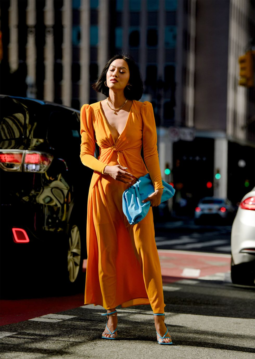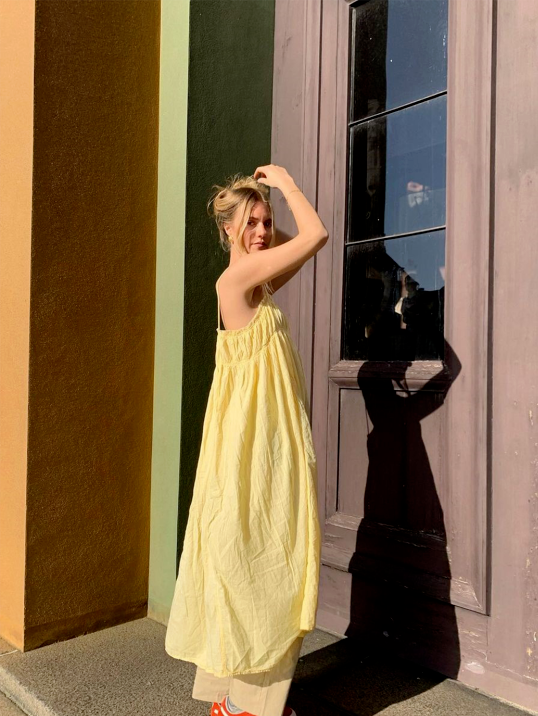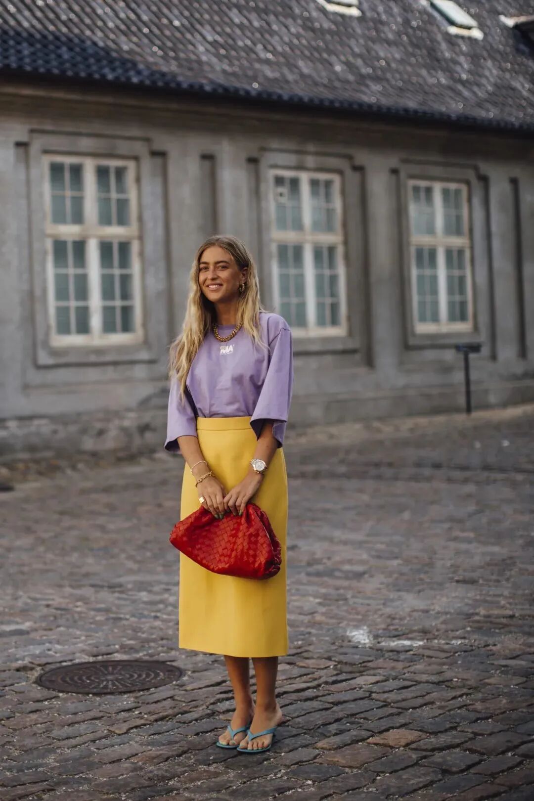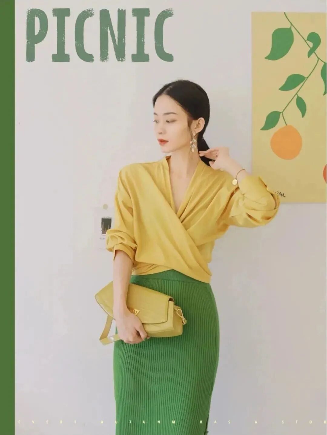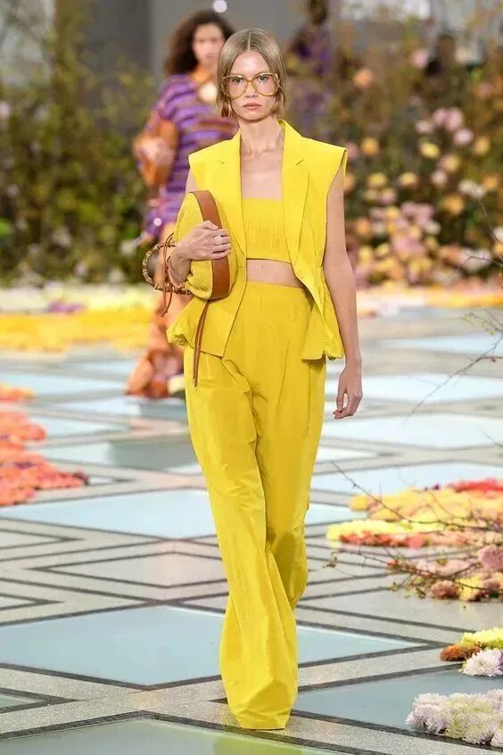 黄色总是与阳光联系在一起,自带温暖与和煦,大面积的高饱和度黄色穿搭,亮眼活泼,而且很有韵味。