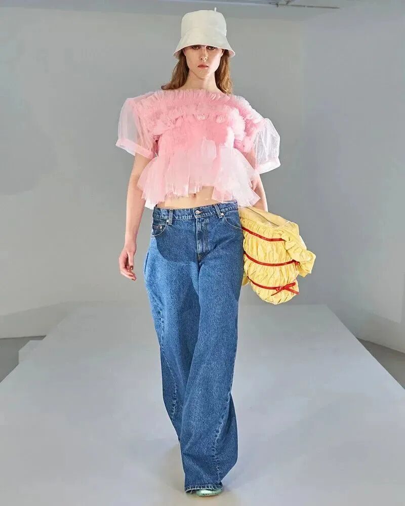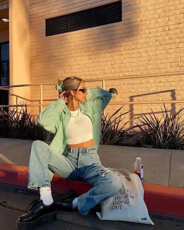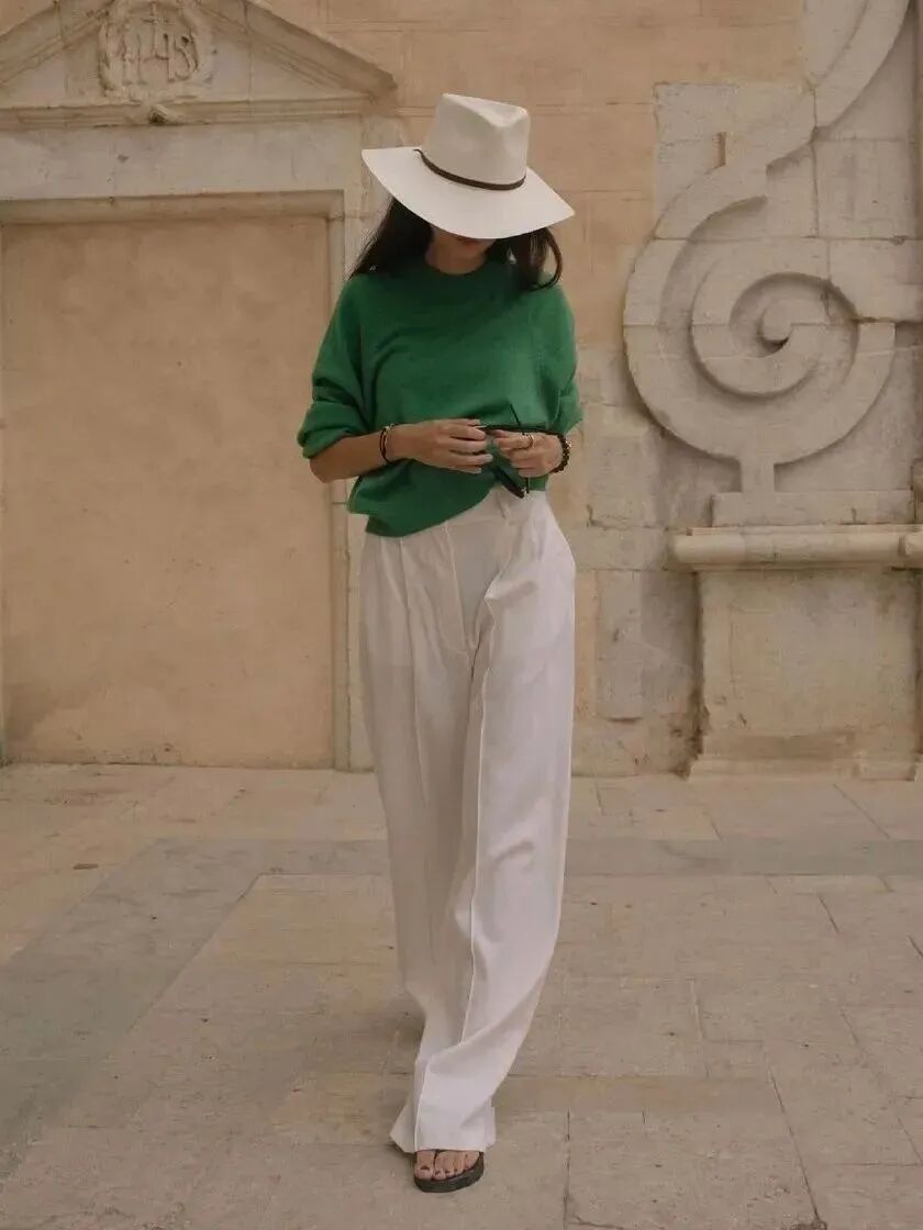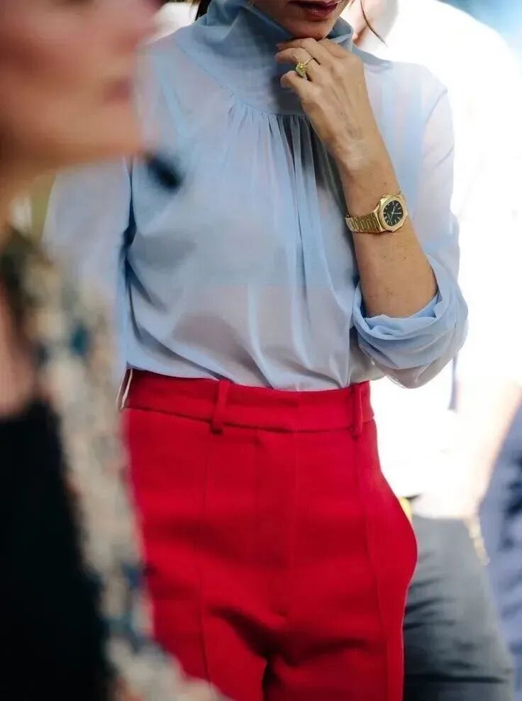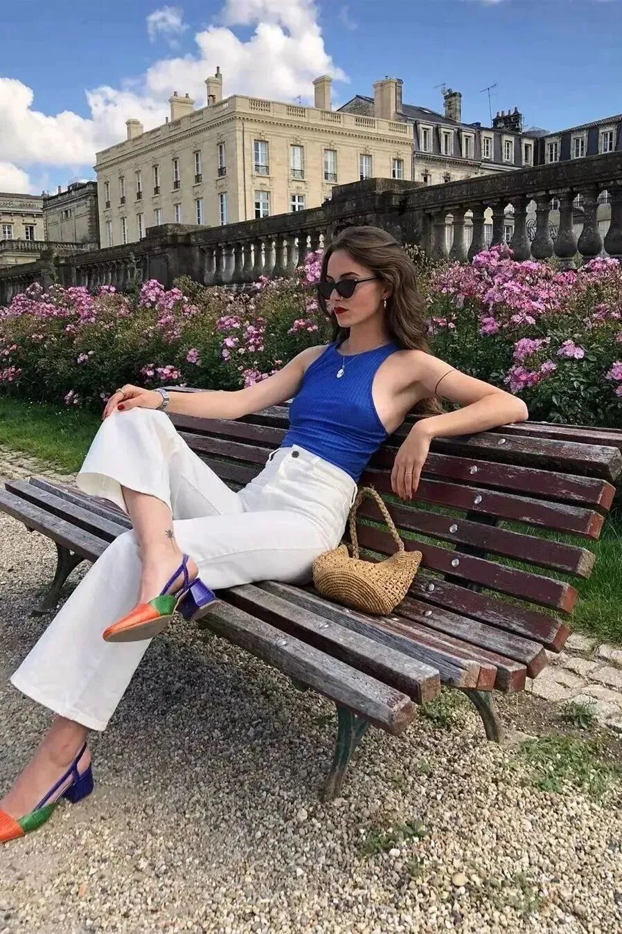 白色上衣与蓝色长裤组合时,既能通勤干练风也能清新唯美风。