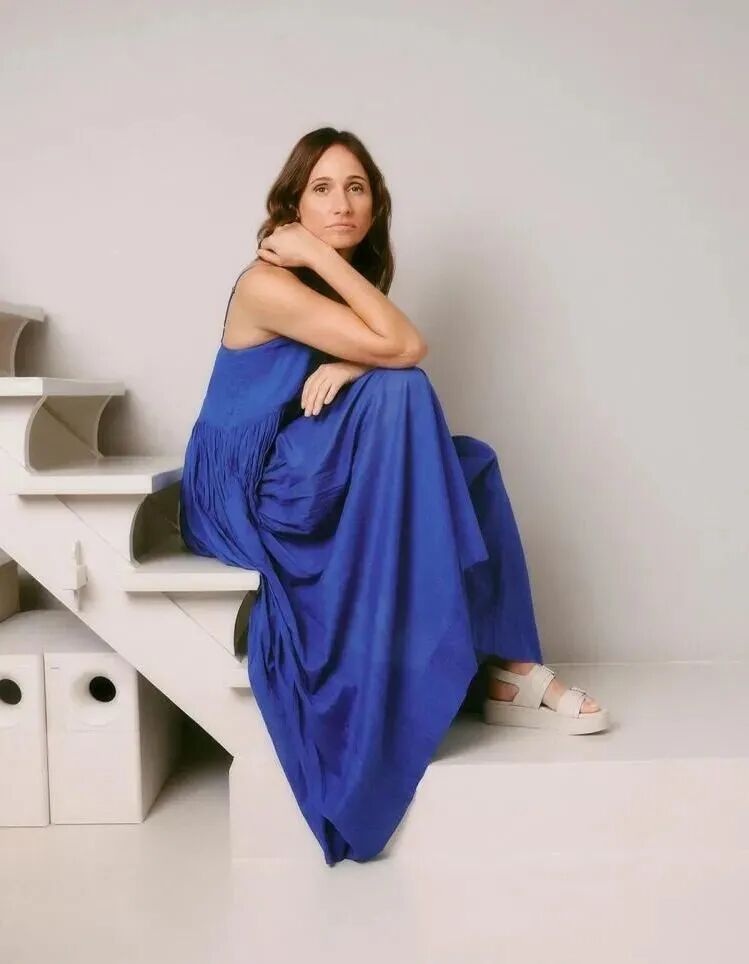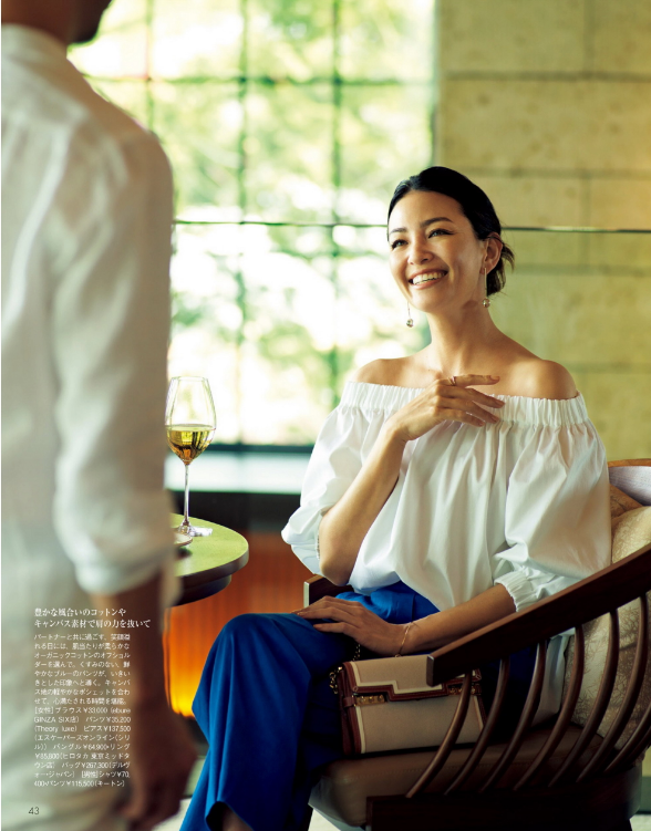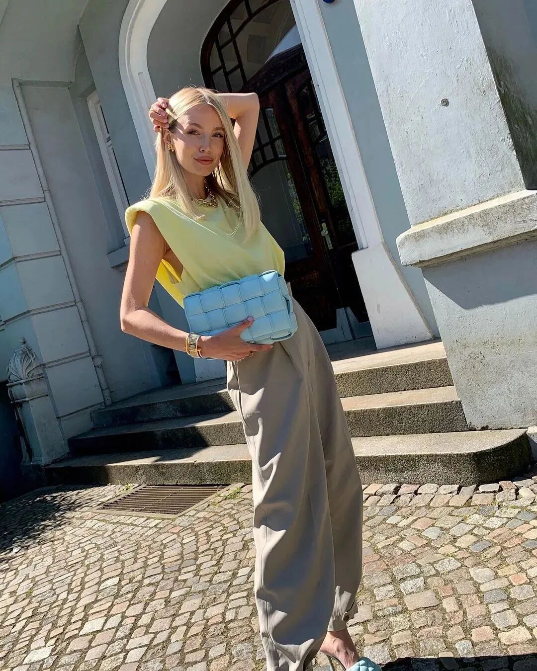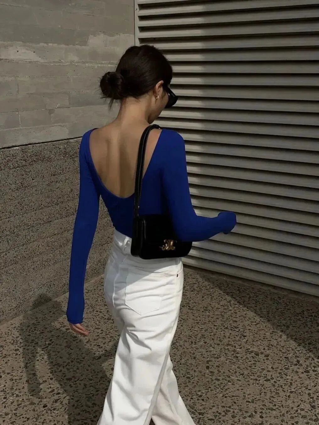 高饱和度的钴蓝色与白色阔腿裤组合,飒爽随性,大气有型。