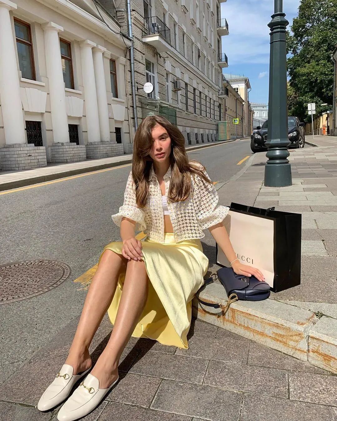 黄色绸缎半裙,与白色镂空小衫组合,高级感立显。