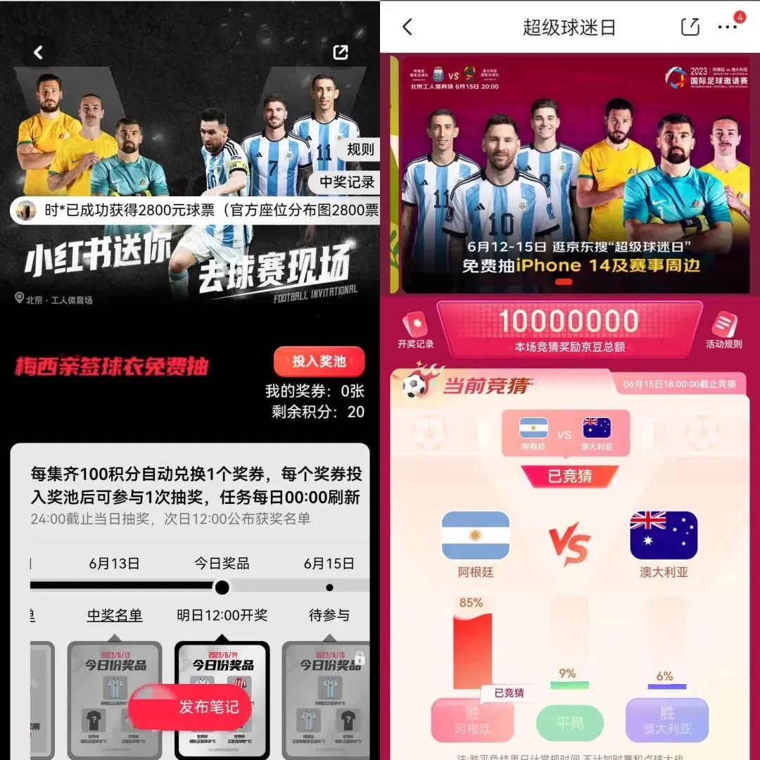 据悉,抖音官方拿到了比赛直播权,并由众多主播直播梅西行程;小红书则用紧俏的门票做起了活动,邀请用户签到、发笔记、打卡和拓新用户等;京东还打造了“超级球迷日”,借着梅西的流量来帮助平台撬动更多的商业价值。