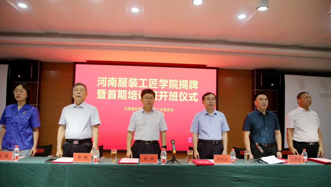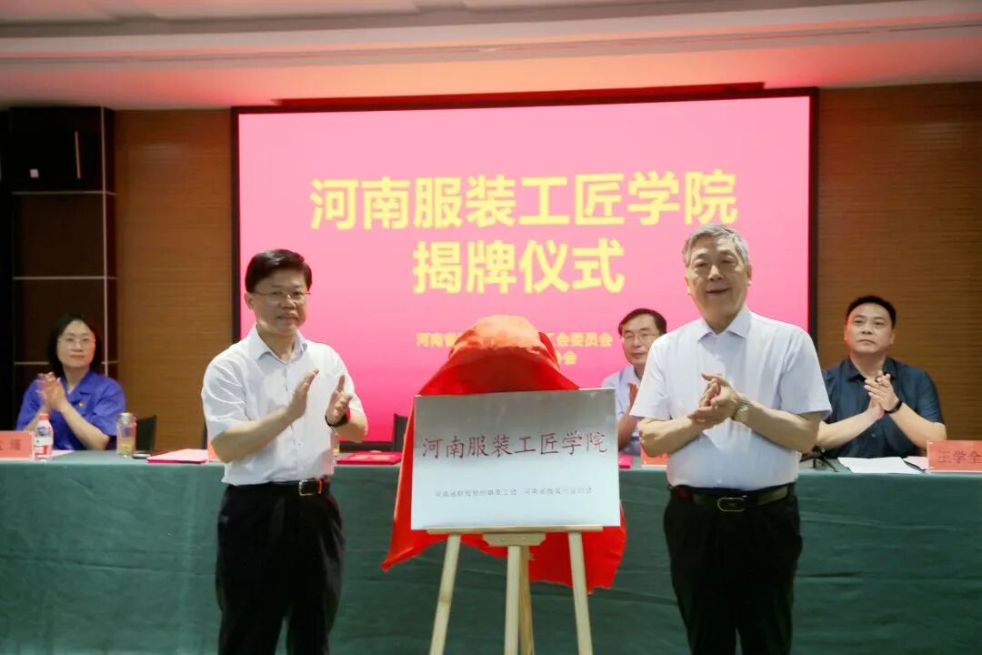 河南省总工会副主席、党组成员张扬,河南省服装行业协会会长李刚共同为河南服装工匠学院揭牌。