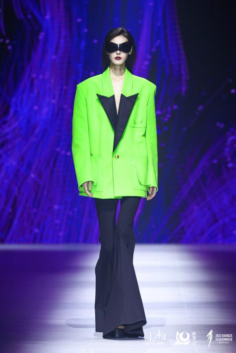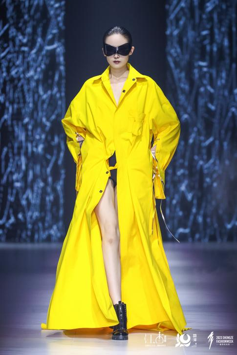 本季发布,总体设计和面料均可无边无界,发布选用的主要面料都采用无卷边工艺,除了面料本身的防晒保暖等功能外,户外面料的成衣也高级化,把面料做不同拆移、组合,一切均往美的可能性发展。颜色上选用高饱和荧光绿、亮黄、大红等或大面积使用或小细节点缀,格外吸睛。版型上聚焦Oversize西装、连体长裙、拖地风衣、v领连体衣等,部分细节搭配金色长筒手套,一整个大女主的秀场氛围不断拉满,哪还有功能性面料的影子。