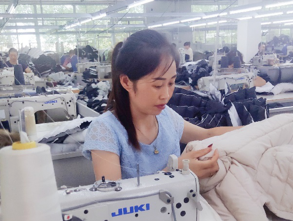 在河南省驻马店市西平县新思维服饰生产车间里,丁贺霞麻利地将衣服袖子套在缝纫机上,...