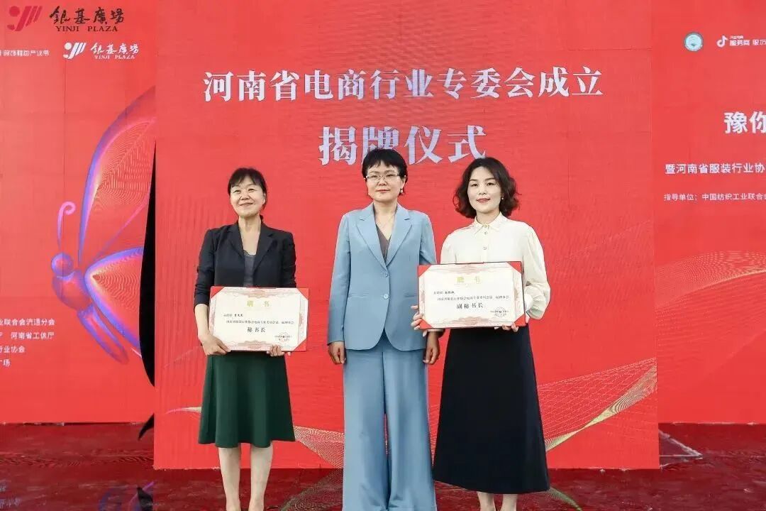 电商专委会会长罗拉为16位专委会副会长授牌、颁发聘书,电商专委会执行会长苗俊雅为专委会秘书长李文杰、副秘书长张敬敏颁发聘书。电商专委会成员共同为河南省服装行业协会电商委员会揭牌!