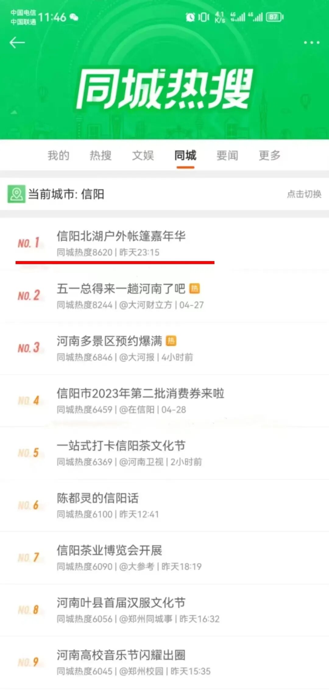关于信阳北湖露营嘉年华的视频和图片被大量转发,登录城市热搜榜。