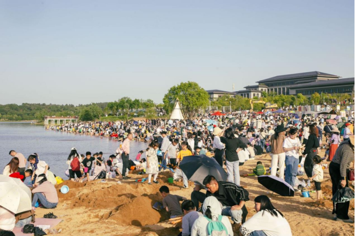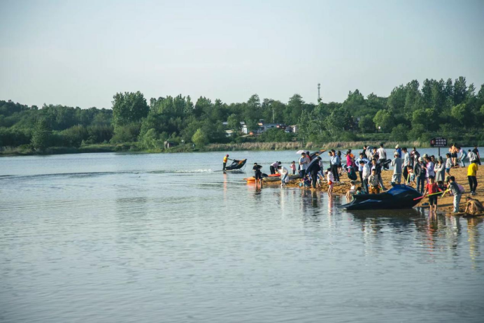 草坪、沙滩、桨板、摩托艇、帐篷、天幕和充满自然风的营地吸引市民纷纷前往北湖打卡。
