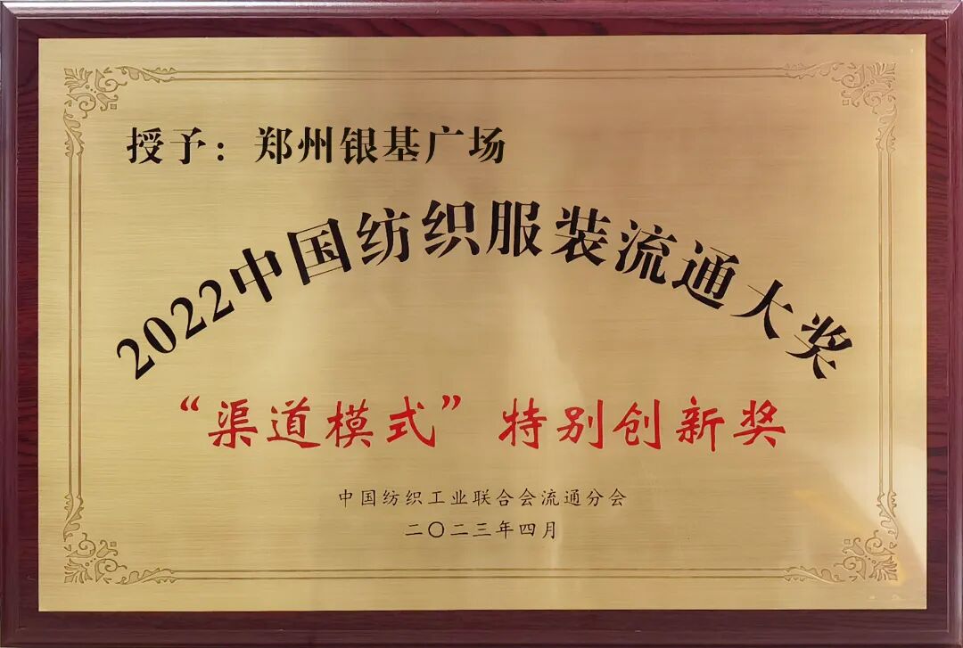 据悉,经过推荐申报、专家评审等环节,2022年度共有15家集体和8名个人获得推荐和表彰。郑州银基广场能够获得“渠道模式”特别创新奖,是中国纺织工业联合会流通分会对银基广场的极大认可与肯定。
