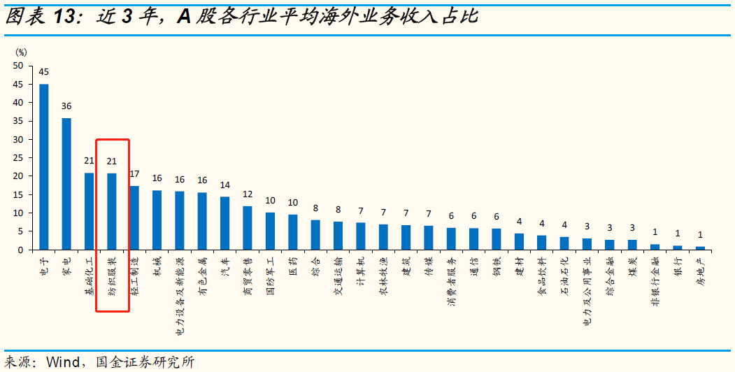 从历史上看,电子、家电、基础化工、纺织服装、轻工制造、机械、电新、有色等行业海外业务收入占比较高。