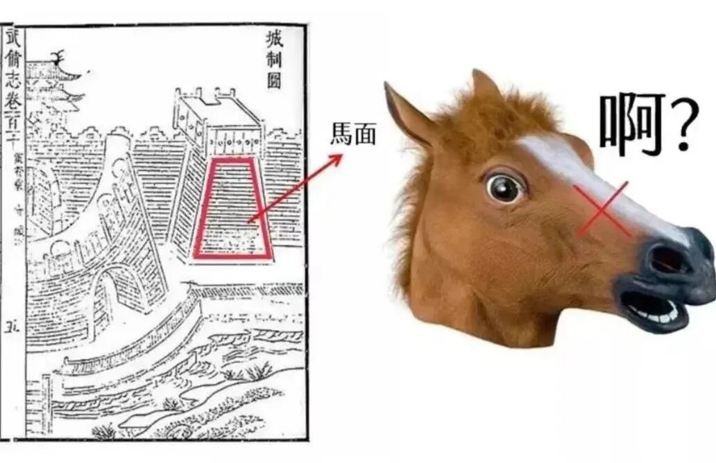 在服饰史中,为了区别这种有马面构造的裙子,而将之称为“马面裙”。而马面也跟一般人想到的马没有关系。“马面”其实是建筑上的词汇,以下引用维基百科:敌台,又称马面,是在城墙或城池旁突出的塔楼式建筑,在正面或两面突出城墙外,其主要功能是加强防御与攻击墙底敌军。