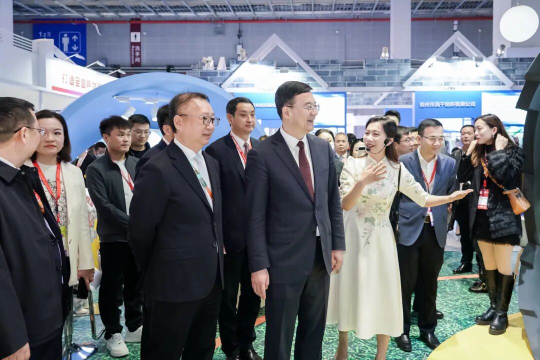 来到湖北展团,行业领导们先后参观了荆州、潜江、襄阳、汉川、天门、仙桃、黄石等产业集群参展商。展团负责人热情地介绍,纺织服装产业是湖北经济社会发展的基础性、民生性、支柱性优势传统产业,是全省重点培育的十大营收超五千亿级产业,这里涌现了"中国织造名城"襄阳市、"中国非织造布产业名城"仙桃市、"全国纺织服装产业园区(试点)"潜江市、中国制线名镇"汉川马口镇""中国女裤名镇"毛嘴镇、"中国婴童装名镇"岑河镇等纺织服装名城名镇。2022年,湖北省纺织服装产业拥有规模以上企业1651家,实现营业收入3358.6亿元,排名全国第五。领导们在了解产业发展情况后,还详细询问企业在产品开发方面的创新性做法,充分赞扬湖北纺织服装产业在产业基础、品牌力、创新力、发展承载力上所付出的努力。