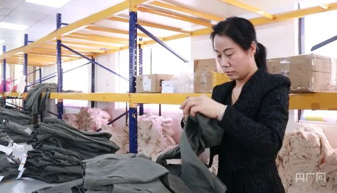 “我就是这个村的人,每天骑着电车来上班,5分钟就到了。”服装车间里,已经完工的成衣如小山一般堆放在桌子上,工人正在对成衣进行质检、贴标、打包,张建萍一边忙着手里的活儿,一边说道。