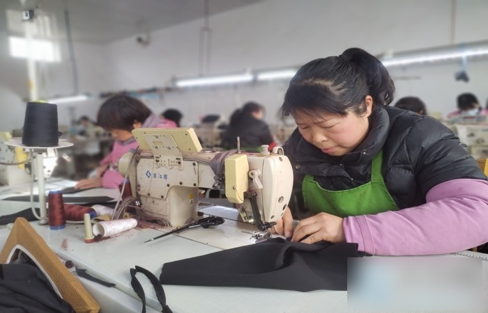 在这里,像雷素英一样因为离家近、时间自由来干活的群众还有很多,村民潘凤娥也是其中之一。“孙子住校了,在家待着着急,吃完早饭来这儿干活还不少拿钱,比啥都强!”潘凤娥说着,一件女装前片已经缝好,又拿起了另一件。