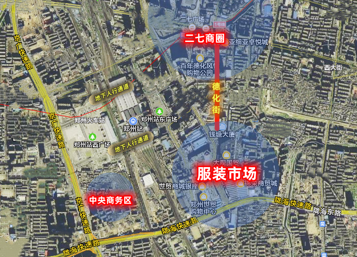 还有在火车站服装商圈与二七商圈之间的德化街,犹如一条黄金通道,将两大商圈无缝衔接。由于德化街北起二七广场与地铁1号线贯通,南抵菜市街与服装市场相连,给消费者出行带来极大便利,日常客流巨大。