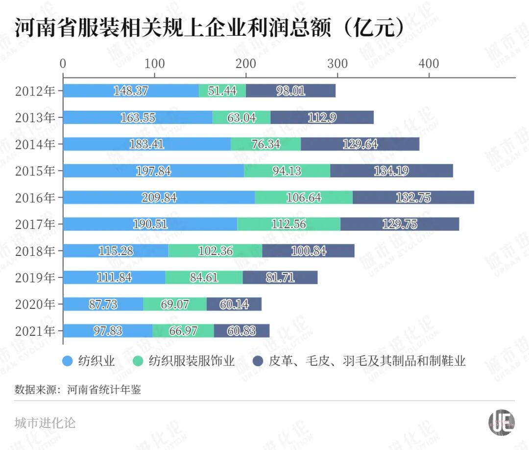 统计年鉴显示,2020年河南服装相关规上企业1782家,较2015年减少313家。营收和利润总额分别为2760亿元、217亿元,均缩水50%左右。虽然这与全国纺织服装服饰业的发展轨迹大体一致,但亦使得河南服装产业的结构性问题加速暴露。