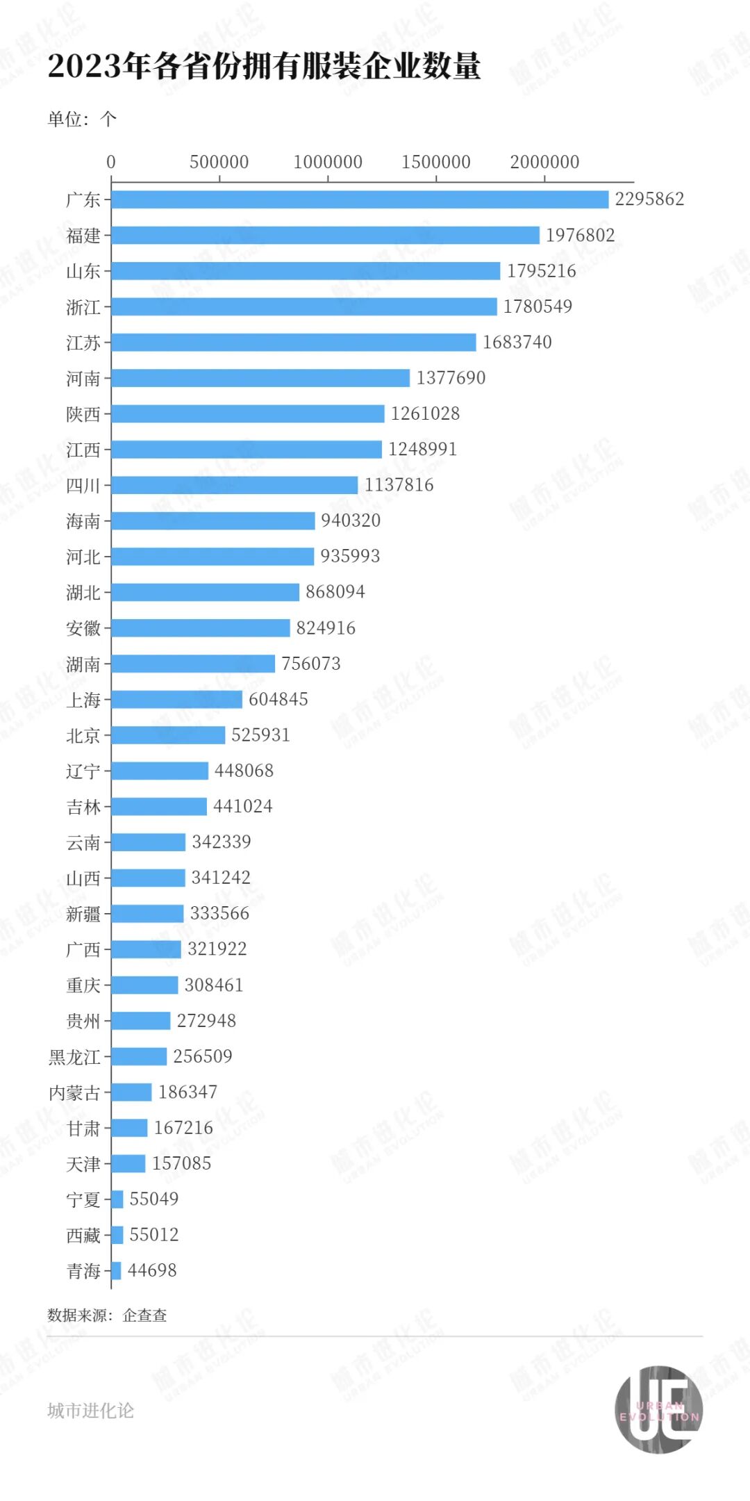 从更大的范围来看,根据企查查提供的数据,全国现有服装相关企业2374万家,其中河南为137.8万家,仅次于广东、福建、山东、浙江、江苏。这也逐渐奠定起河南在纺织服装行业前六强的“江湖地位”。