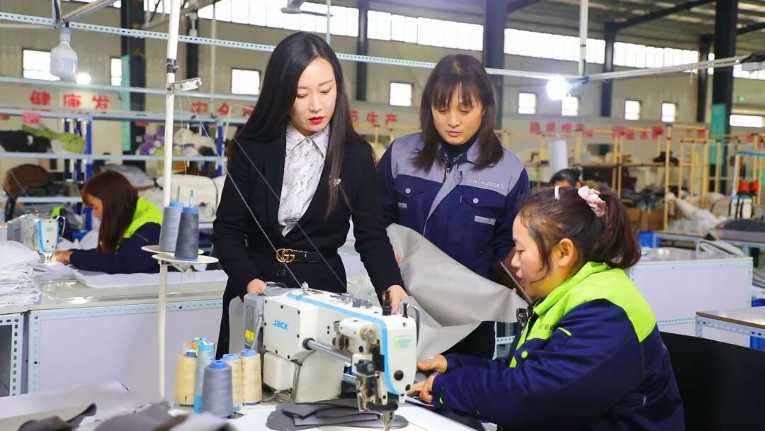 王洁(左一)正在车间察看工人缝纫情况 宋爱平 摄