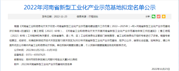 近日,河南省工信厅发布《2022年河南省新型工业化产业示范基地拟定名单公示》,新...