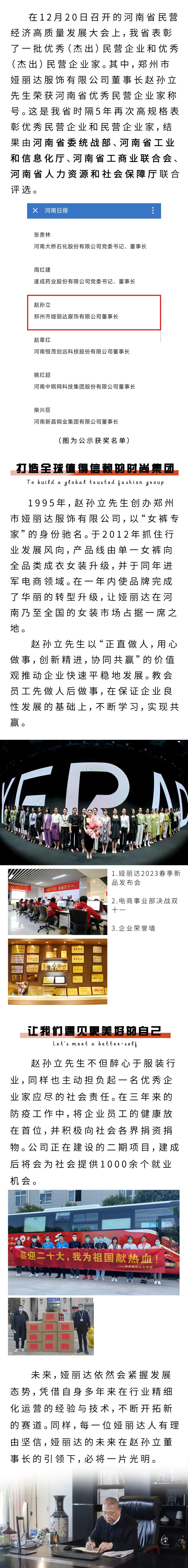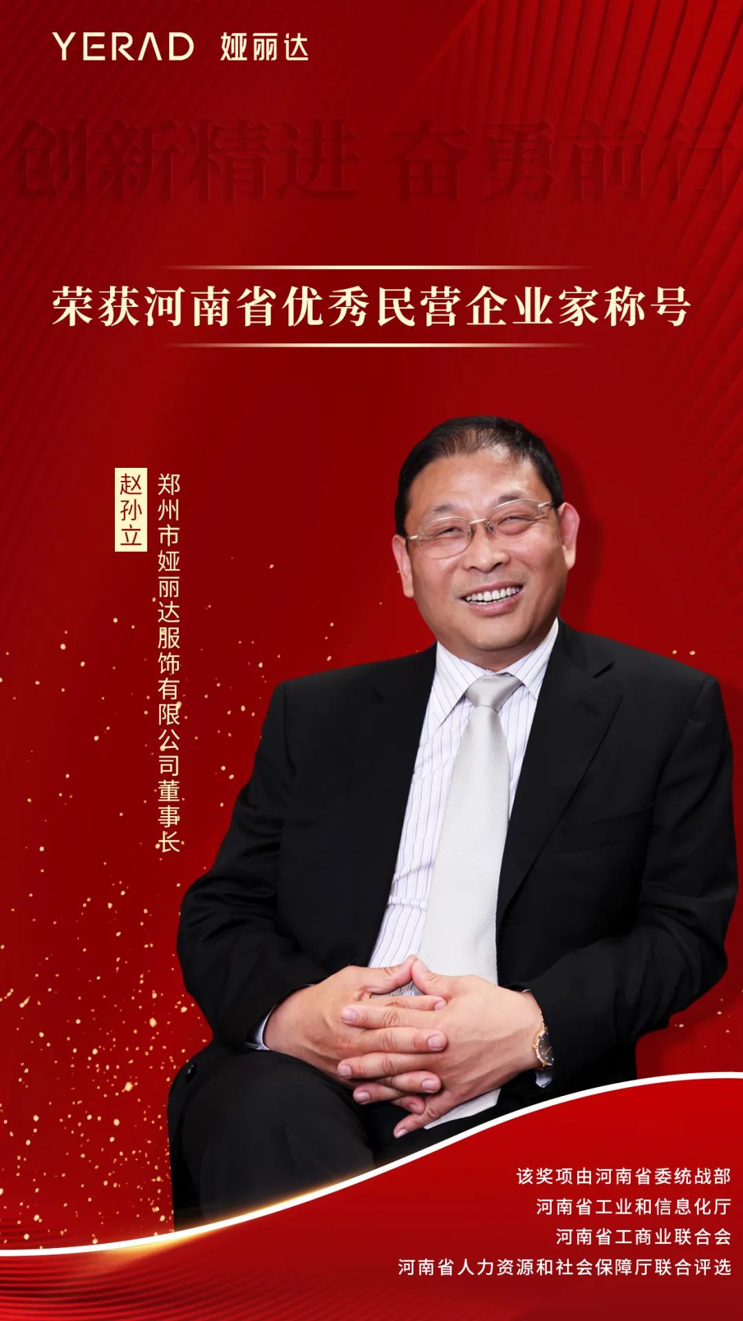 娅丽达服饰董事长赵孙立荣获“河南省优秀民营企业家”称号!