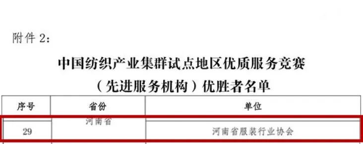 日前,中国纺织工业联合会公布了“中国纺织产业集群试点地区优质服务竞赛(先进服务机构)优胜者”名单。河南省服装行业协会获得“中国纺织产业集群试点地区优质服务竞赛(先进服务机构)优胜者”称号。