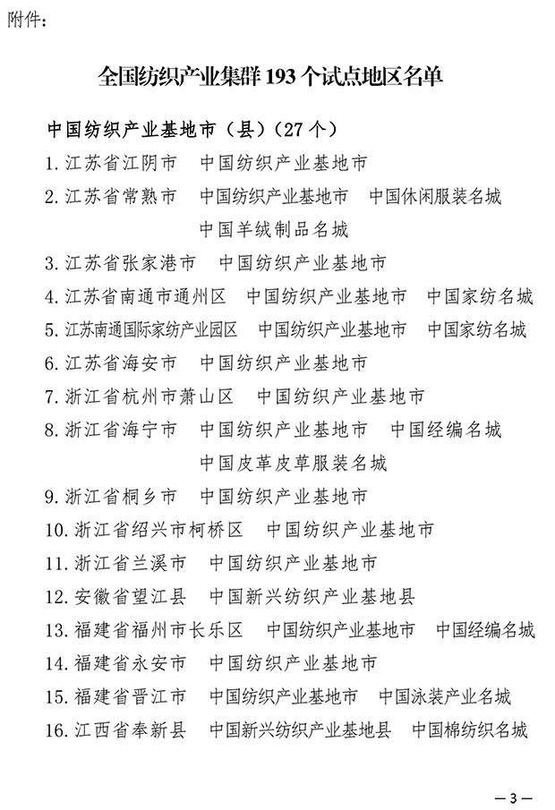 附件:全国纺织产业集群 193 个试点地区名单