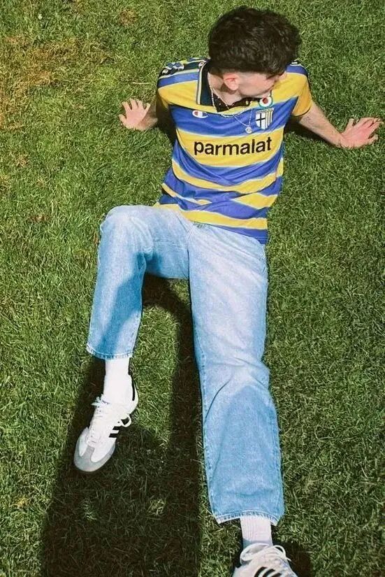 拆解这一穿搭公式中的单品,不难发现球衣、牛仔裤、复古板鞋,均是近年热门的单品, 三者的叠加也正符合当下热门Clean Fit 的搭配风格。