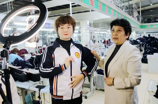 郭静丽(右)在自己创办的扶贫车间内通过直播推广最新产品。
