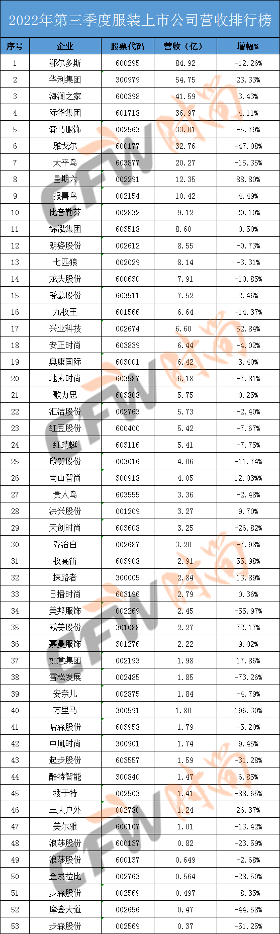 转眼间,2022年已经步入了尾声。随着各大服饰品牌公布三季度财务报表,对于这一年的经营情况,也可以说是初见端倪了。从统计的数据来看,三季度的运营情况并不比上半年乐观,53家上市服企中,仅23家营收实现正增长,占比还未过半。