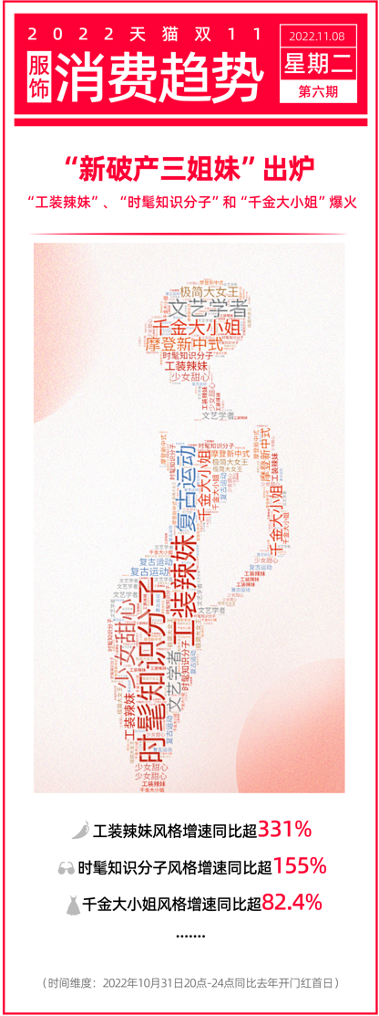 11月8日消息,根据真实洞察发布,2022天猫双11服饰行业消费趋势:“工装辣妹...
