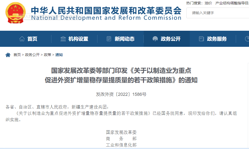 日前,国家发改委、商务部、工业和信息化部、自然资源部、生态环境部、交通运输部联合印发了《关于以制造业为重点促进外资扩增量稳存量提质量的若干政策措施》,明确提出:进一步加大制造业引资力度,着力解决外商投资企业面临的突出问题,全面加强外商投资促进和服务,推动利用外资高质量发展。目的很明确,就是更好发挥利用外资促进我国制造业高质量发展。具体是进一步扩大外资流入,稳定外商投资规模,提高利用外资质量,使制造业更深融入全球产业链供应链。为实现这个目标,文件提出三项措施:一是优化投资环境,扩大外商投资流入;二是加强投资服务,支持外商投资企业发展;三是引导投资方向,提升外商投资质量。针对引导投资方向,文件明确,在节能环保方面,重点鼓励外商投资新能源、绿色低碳关键技术创新和示范应用等领域。在区域布局方面,给予中西部和东北地区基础制造、适用技术、民生消费等领域政策支持。文件还提出,鼓励外资充分发挥资本和技术优势,深入参与智能制造,建设智能制造示范工厂。引导外资积极参与国家新型工业化产业示范基地、先进制造业集群建设。积极引入国际创新资源,提升重大科技基础设施对外开放合作水平,支持外商投资企业承担国家科技计划项目、引进国际一流人才团队。二十大后,国家部委联合发文助力制造业发展,充分表明制造业的地位。二十大报告中明确提出:“建设现代化产业体系,坚持把发展经济的着力点放在实体经济上,推进新型工业化,加快建设制造强国、质量强国、航天强国、交通强国、网络强国、数字中国。”这是对实体经济的重新定性。这意味着,实体经济和制造业放在了前所未有的高度,将成为未来中国经济发展的重头戏。中国企业联合会党委书记、常务副会长兼理事长朱宏任表示,中国拥有广大市场和雄厚的制造业基础,有完整的产业链和供应链,中国制造业的配套能力在中低端有绝对的优势。欧洲的企业加大在华投资的数据也显示欧洲企业坚定看好中国的未来。他同时指出,中国的产业链韧性和安全也面临着一些问题和挑战,应更加注意在防控好疫情的前提下,保证供应链的顺畅。