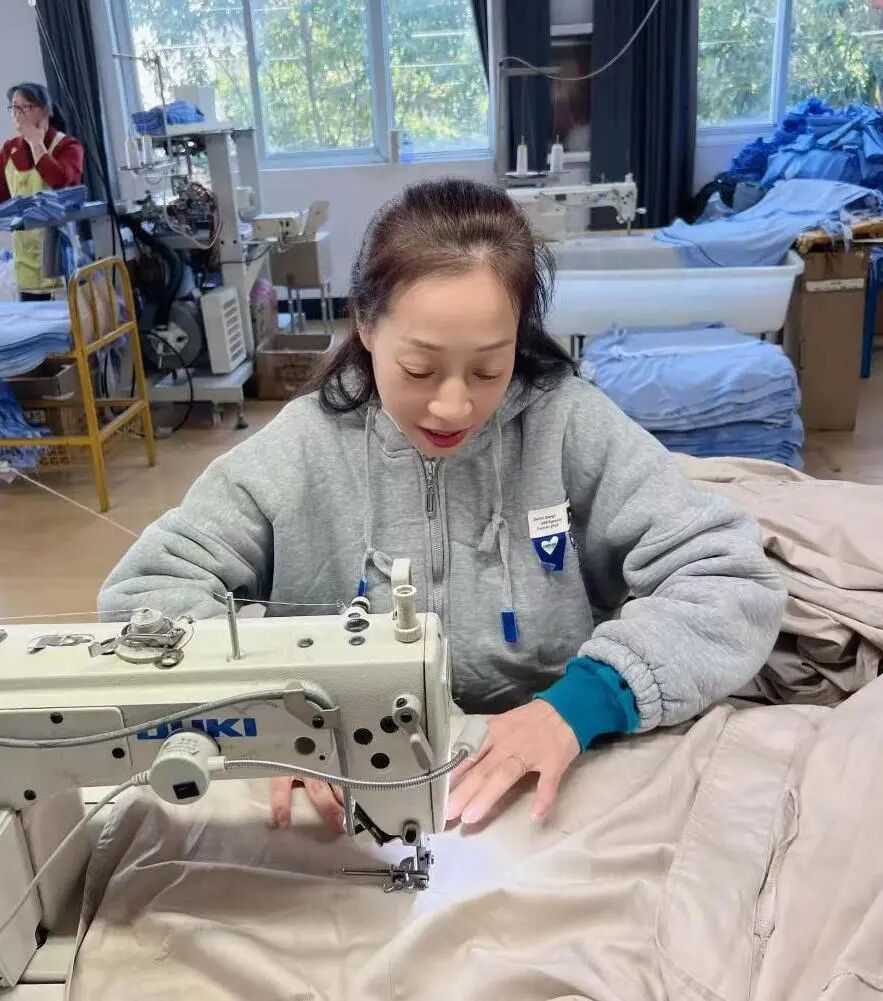 我叫舒李伟,今年四十岁,已经在罗蒙做缝纫工十年了。我的丈夫常年在外务工,一年回来的次数屈指可数,我则留在家里照顾两位老人和两个孩子,在我们村里,像我这样的留守妇女有很多,我们既渴望工作赚钱实现自己的价值,又想要兼顾家庭。在罗蒙工作,平时骑电动车上下班只要十分钟,照顾老人小孩非常方便,我也实现了赚钱和养家两不误。