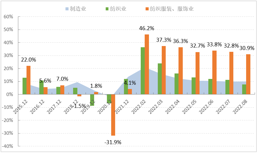 8月,我国服装行业固定资产投资增速小幅回落,但仍继续保持较快增长,显示出随着各级政府加大产业补链强链投资的支持力度,企业对行业高质量发展的信心逐渐增强,在自动化数字化智能化技术改造升级、品牌建设以及区域布局调整等领域加大投资,产业转型升级深度推进。根据国家统计局数据,1-8月,我国服装行业固定资产投资完成额同比增长30.9%,增速比2021年同期提升26.1个百分点,高于纺织业和制造业整体水平23.3和20.9个百分点。