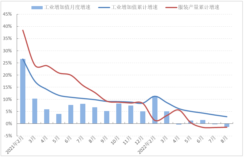 8月,受国内疫情散发多发、市场需求不足、订单加速外流以及部分省市高温限电等因素影响,服装行业规模以上企业工业增加值降幅有所加深,服装产量连续三个月负增长,服装生产恢复进程明显放缓。根据国家统计局数据,8月,服装行业规模以上企业工业增加值同比下降1.3%,降幅比7月加深1.1个百分点;1-8月,服装行业规模以上企业工业增加值同比增长2.9%,增速比1-7月放缓0.7个百分点,比2021年同期放缓7.0个百分点。同期,规模以上企业完成服装产量152.59亿件,同比下降1.42%,降幅比1-7月收窄0.12个百分点,比2021年同期下滑14.27个百分点;其中,梭织服装产量为57.36亿件,同比下降2.07%;针织服装产量为95.23亿件,同比下降1.03%。
