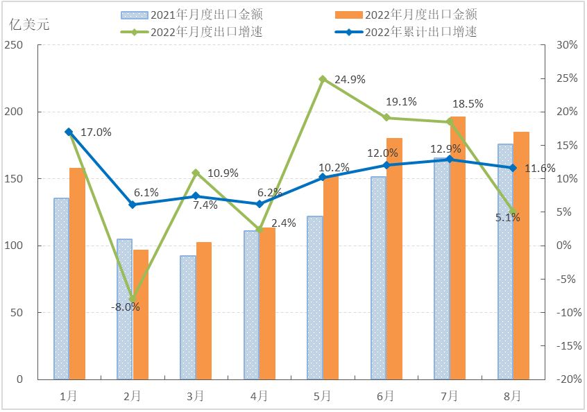 1-8月,我国服装出口在2021年高基数的基础上继续保持较快增长,呈现出较强发展韧性。但是受美国“涉疆法案”正式生效的影响,8月当月服装出口增速明显放缓,尤其是对美国棉制服装出口呈现两位数大幅下降。根据中国海关数据,1-8月,我国累计完成服装及衣着附件出口1180.34亿美元,同比增长11.6%,增速比1-7月放缓1.3个百分点;8月当月服装及衣着附件出口184.86亿美元,同比增长5.1%,比7月当月增幅放缓13.4个百分点。