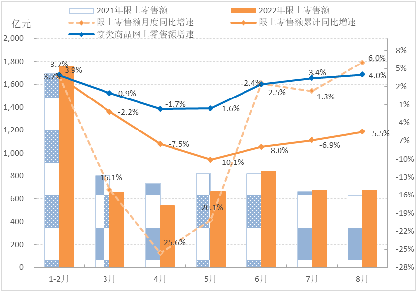受益于各级政府高效统筹疫情防控和经济社会发展,以及促消费政策落地显效,国内服装销售市场保持良好恢复态势,网上零售增速稳步回升,实体门店经营向好。但是,由于国内疫情散发多发对居民社交出行、商业运营依然造成较大限制,居民对服装类商品的可选性消费意愿仍有待进一步提升。根据国家统计局数据,8月当月限额以上单位服装类商品零售额同比增长6.0%,增速比7月加快4.7个百分点;1-8月,我国限额以上单位服装类商品零售额累计5814亿元,同比下降5.5%,降幅比1-7月收窄1.4个百分点。线上服装零售保持稳定增长,1-8月穿类商品网上零售额同比增长4.0%,增速比1-7月加快0.6个百分点。暑假出行、社交消费意愿增强带动实体门店经营持续改善,根据中华全国商业信息中心的统计数据,8月,全国百家重点大型零售企业服装类商品零售额同比增长2.1%,高于7月3.6个百分点。