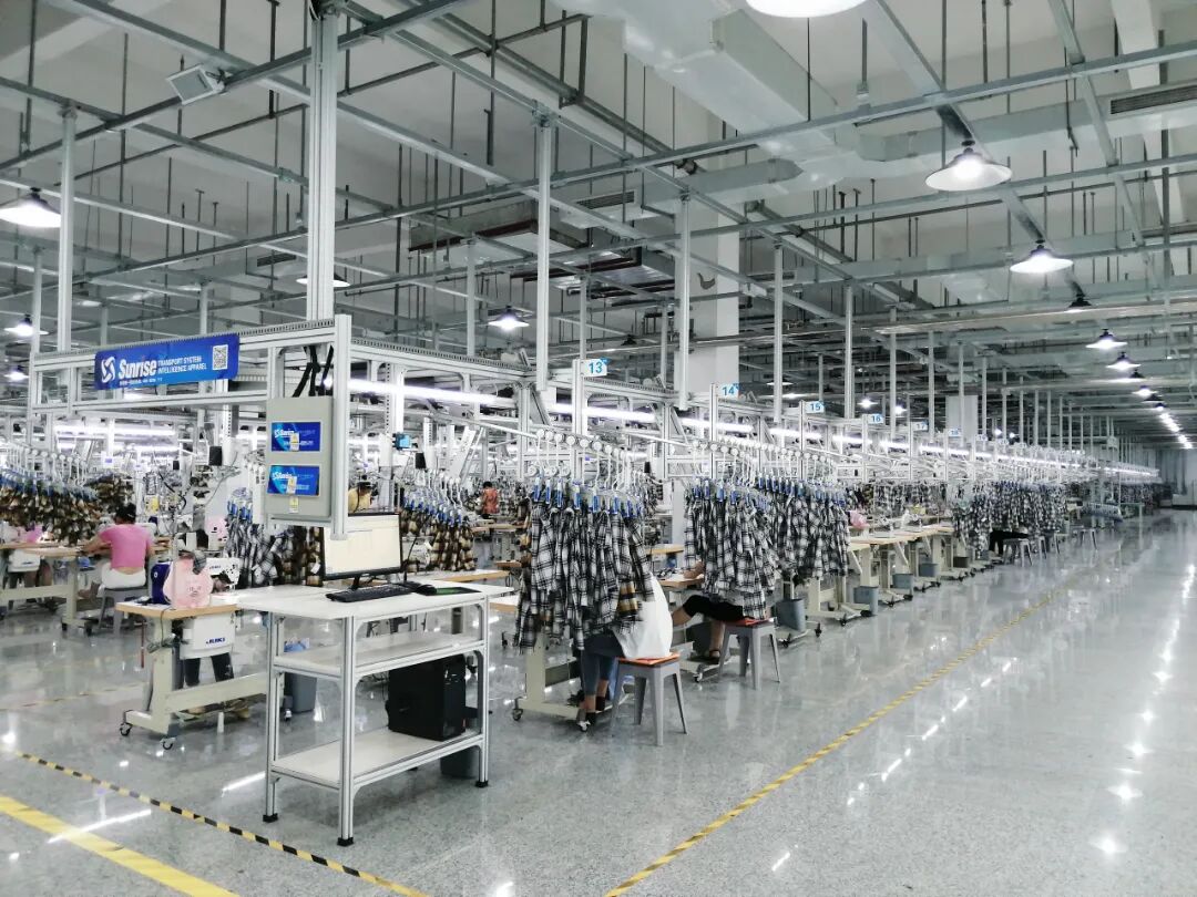在盛泰浩邦纺织工业园,自动码布机将数十层布料送至智能裁床,经过电脑激光切割,数十层衣片一会儿就裁好了。衣片按照不同品种和规格分类,被送到指定裁缝工位。工位上方,“智能吊挂系统”自动行进,将衣服的半成品传送到相应岗位。