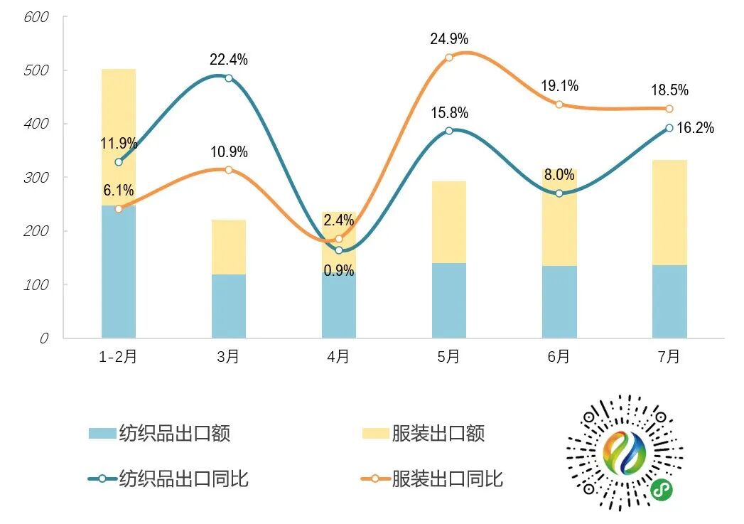 1-7月全国纺织品服装出口同比增长12.4%