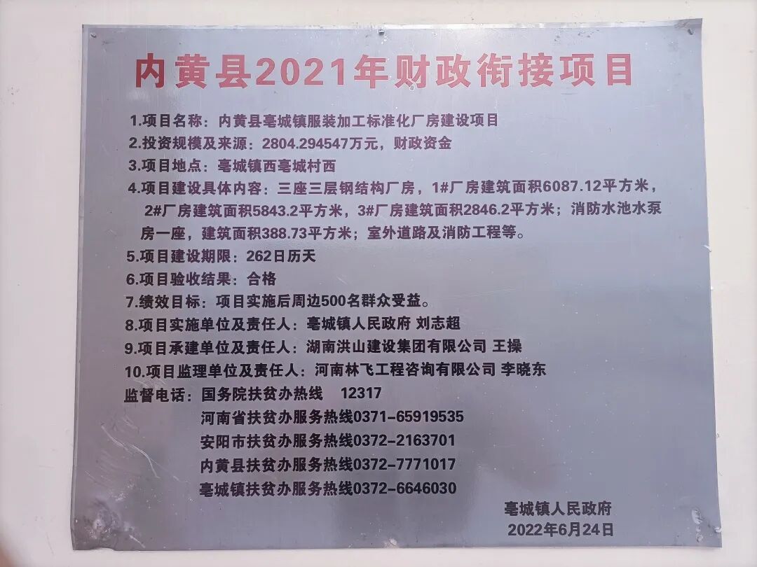 2021年3月31日,内黄县亳城镇人民政府与河南省服装行业协会密切配合,规划建设的内黄县亳城镇服装加工标准化厂房建设项目顺利举行开工仪式,该项目投资2900万元,建筑面积15205平方米的标准化厂房建设项目已于2022年2月底正式开工投产,宿舍等配套项目于2022年6月底顺利完工。