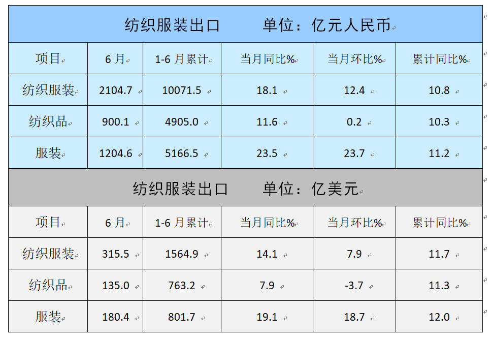 根据海关总署发布的数据,按美元计,2022年上半年纺织服装累计出口1564.9亿美元,增长11.7%,其中纺织品出口763.2亿美元,增长11.3%,服装出口801.7亿美元,增长12%。