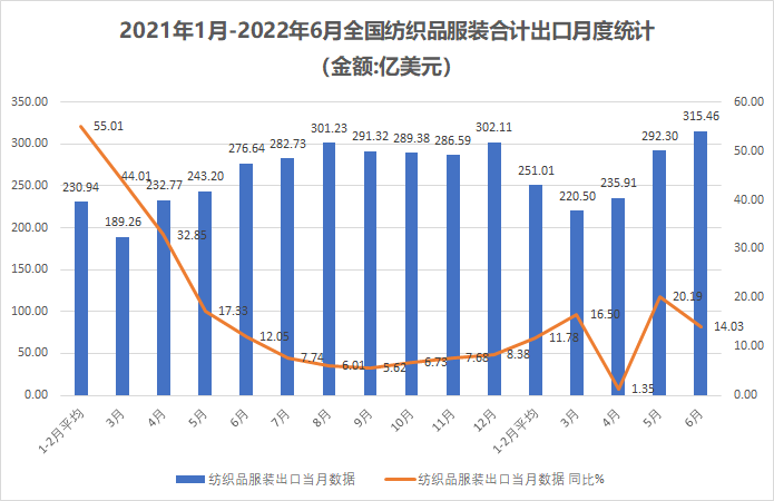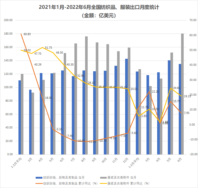 2022年上半年纺织服装累计出口1564.9亿美元,增长11.7%。