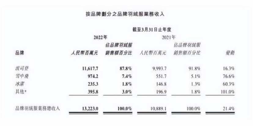波司登品牌仍然是公司的主要收入来源,营收从20/21年度的99.94亿元飙升至21/22年度的116.18亿元,占公司年度总营收的71.7%。
