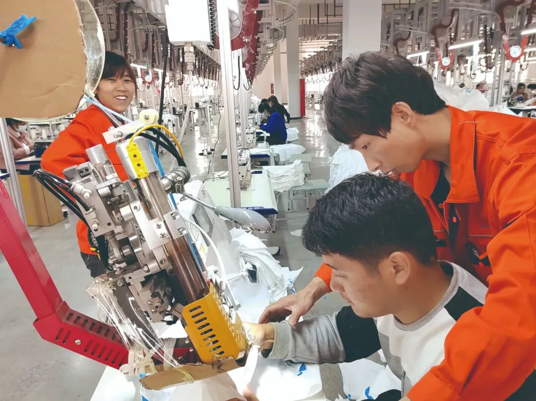 2021 年,河南省从事服装生产、设计、贸易的公司、工厂、机构和商户约167000 家,从业人员约480 万,年产各类服装35 亿件,年销售3300 亿元,在全国占比百分之七点多,位居第六位。河南省服装行业协会作为链接政府和企业的桥梁,在推动行业发展中发挥了重要作用。据李刚介绍,目前,西平县、息县、长垣市、淮滨县、光山县、项城市、邓州市、叶县、新野县、夏邑县等十余个县域都与河南省服装行业协会建立了战略合作关系,西平嫘祖服装新城、长垣职业装小镇、淮滨临港国际服装城等各具特色的现代化园区纷纷崛起,成为县域经济高质量发展的新地标。2013 年,河南“巧媳妇工程”正式启动,通过引导产能下沉,成功整合培训了70 万“三无”农村留守妇女,将其培训成为服装产业大军,带动20 万贫困家庭脱贫,构建中心工厂+ 卫星工厂6800个,形成优质产能1500 亿元/ 年。李刚告诉记者,2021 年,创新性地提出了“巧媳妇工程”升级版——“百镇千村万条线”工程,引导企业将产能下沉到镇村,将龙头企业建在县区,将缝前缝后放在公司,让缝中走进百姓家,实现家家都有巧媳妇,月月工资送上门,协同作业,致富农民。李刚介绍,目前“百镇千村万条线”工程已在内黄县亳城镇率先实施,2022 年2 月21 日,河南卡顿地智能制造有限公司正式投产运营,企业满负荷运营后,能带动周边村镇1000 余人就业,年产值将达到2.5 亿元,年度缴纳税收可达500 万元以上,每年为当地员工发放3500 万元工资,最大限度激活当地经济内循环。