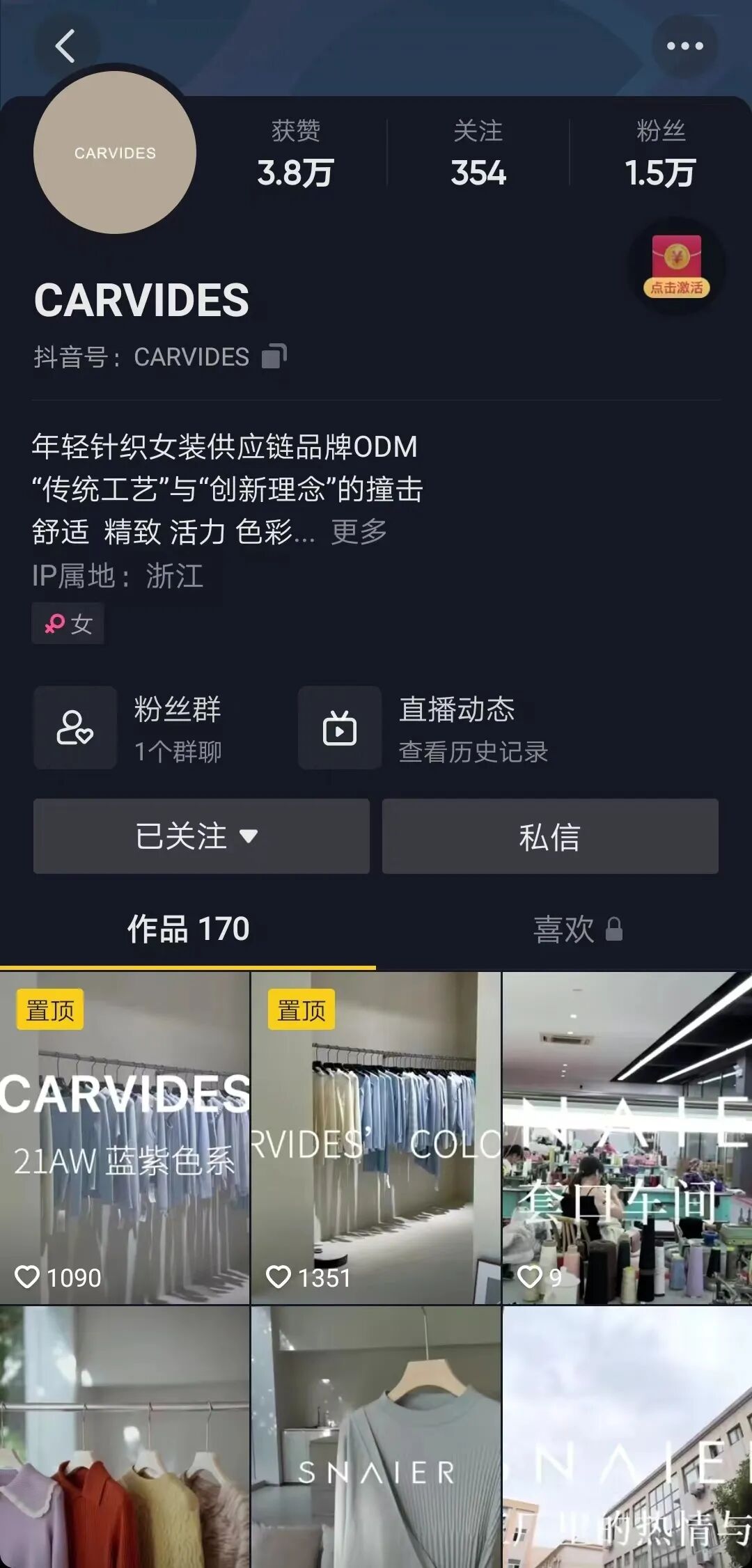 去年,在夏丞骏的主导下,公司招引了10多名平均年龄在26岁左右的年轻人,组建了新媒体营销部,在小红书、抖音等线上平台打造年轻的产品线“CARVIDES”,每日更新有关产品和产线的图文、短视频,为企业持续引流。