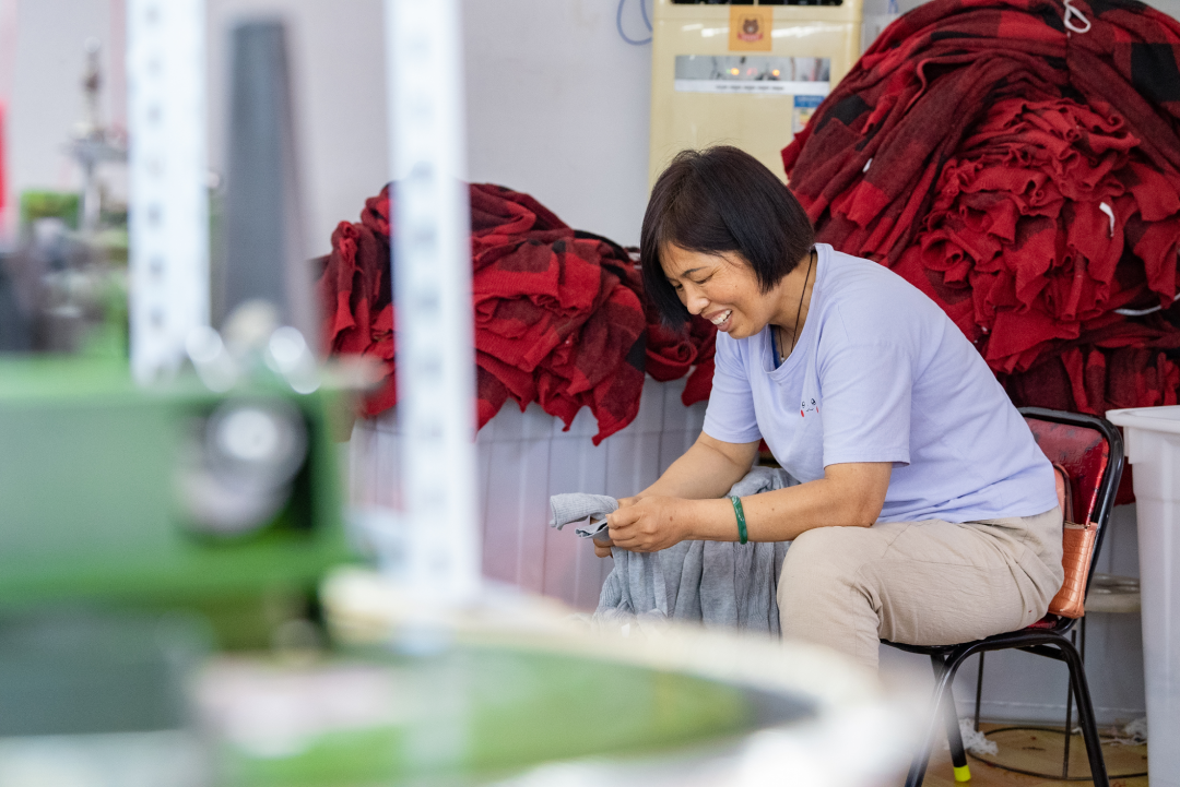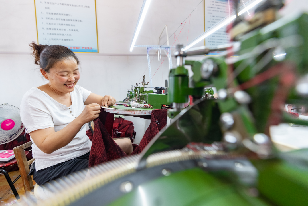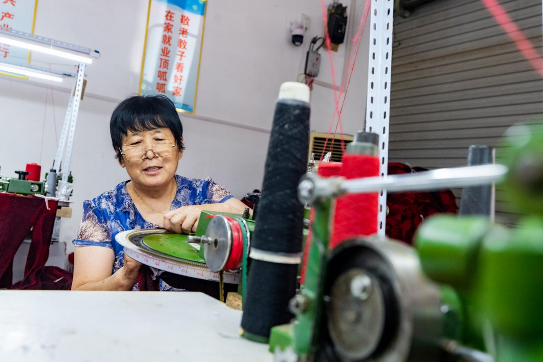 梁素贞是缝盘车间里的老大姐,从她家出来不到30米,就是她上班的地方。虽然年龄偏大,但她业务能力丝毫不逊色于年轻人。随着技术越来越熟练,她现在一个月能加工近400件产品,加上基础工资,每月增收约3000元。她笑着说,她才是典型的“家门口就业”受益人。