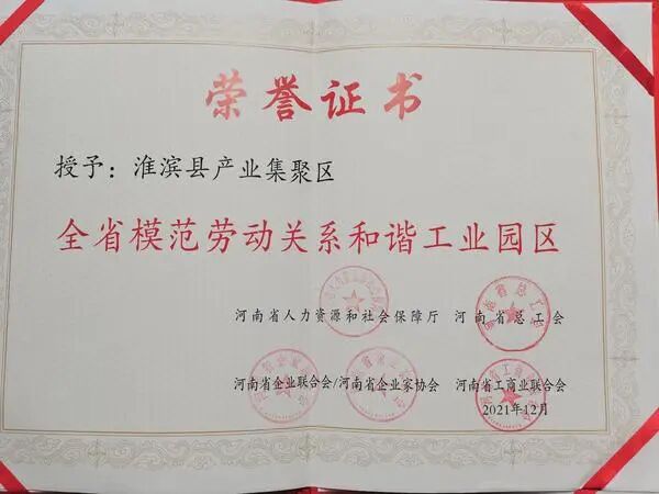 淮滨县先进制造业开发区被授予“全省模范劳动关系和谐工业园区”荣誉称号