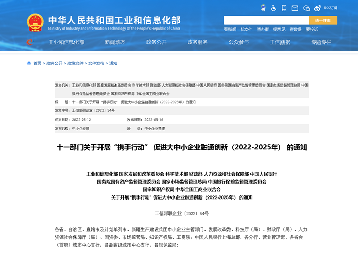 5月16日,工信部发布《工业和信息化部等十一部门关于开展“携手行动” 促进大中小企业融通创新(2022-2025年)的通知》(下称《通知》)。《通知》提出,要以创新链、产业链、供应链、数据链、资金链、服务链、人才链“七条链”为重点,推动大中小企业融通创新。