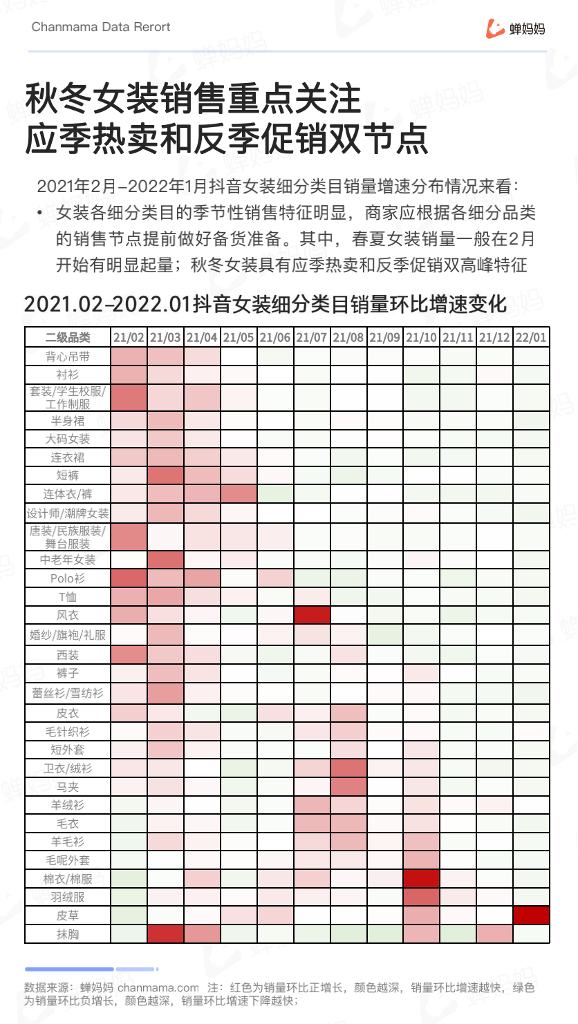 2021年2月-2022年1月抖音女装细分类目销量增速分布情况来看: