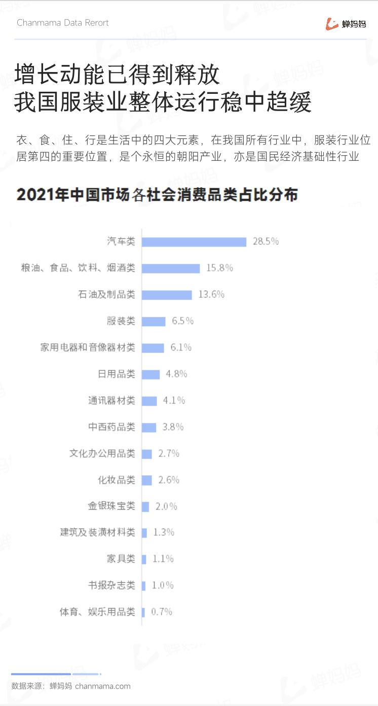 衣、食、住、行是人们生活的四大元素,服装在我国所有行业中抢占第四的重要位置,亦是国民经济基础性行业。
